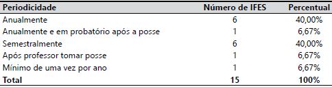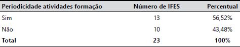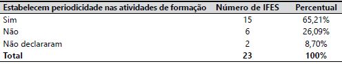 Na Tabela 5 observa-se que quase dois terços das IFES declaram que há a definição de uma periodicidade nas atividades de formação continuada. Cabe destacar que duas instituições não declararam se há, ou não, periodicidade em suas atividades.