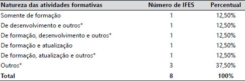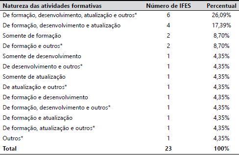 No tocante à natureza das atividades formativas, 43,48% (Tabela 6) das IFES indicam que as atividades de formação continuada focam-se, principalmente, nos seguintes aspectos: (1) Formação (melhoria da prática pedagógica); (2) Desenvolvimento (favorecer o desenvolvimento profissional dos professores, contribuindo para uma consequente melhoria da prática pedagógica); (3) Atualização (relativa aos conhecimentos específicos).
