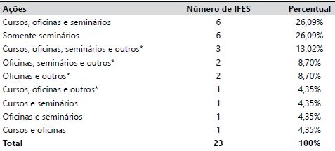 Quando consideradas as ações oferecidas pelas IFES em suas atividades de formação continuada, não é observada uma ação convergente entre as instituições participantes do estudo, Tabela 7. Dentre as opções do instrumento de pesquisa, temos que 39,11% das IFES declaram utilizar as seguintes ações: cursos; oficinas; seminários; dentre outras ações.