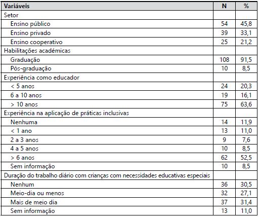 Participaram neste estudo 118 educadores de infância portugueses, dos quais 116 eram do sexo feminino (98,3%), sendo apenas 2 do sexo masculino (1,7%). Relativamente à idade, 22.9% tinham entre 22 e 31 anos, 50,0% tinham entre 32 e 41 anos, 21,2% tinham idade compreendida entre os 42 e os 51 anos e apenas 5,9% tinham idade superior. Metade da amostra era proveniente da zona norte de Portugal, 33,1% da zona centro e apenas 13,6% da zona sul do país (sem informação sobre a zona geográfica de proveniência de 3,4% da amostra). No Quadro 1 é apresentada a caracterização da amostra em função do setor, habilitações académicas, experiência de trabalho como educador e experiência de trabalho com crianças com necessidades especiais. Relativamente ao setor de trabalho, quase metade dos participantes trabalhava numa instituição da rede pública de ensino, sendo que os restantes provinham de instituições de ensino privadas (33,1%) e de estabelecimentos de ensino cooperativo (21,2%). Relativamente às habilitações académicas, a grande maioria dos educadores possuía apenas licenciatura ou bacharelato, e, somente 8,5% da amostra tinha qualificações académicas de nível pós-graduado (pós-graduação ou mestrado). A maioria dos participantes tinha mais de 10 anos de experiência como educador (ver Quadro 1). A amostra era relativamente heterogénea, no que concerne ao número de anos de experiência na aplicação de práticas inclusivas: 11,9% reportou não ter nenhuma experiência, 11% relatou estar a aplicar este tipo de práticas há apenas um ano, 7,6% relatou ter 2–3 anos de experiência, 8,5% entre 4–5 anos de experiência e 52,5% relatou aplicar este tipo de práticas há mais de 6 anos. Relativamente à percentagem do dia que cada educador dedicava ao trabalho direto com crianças que se beneficiavam de serviços de educação especial, verificou-se, igualmente, bastante heterogeneidade (ver Quadro 1).