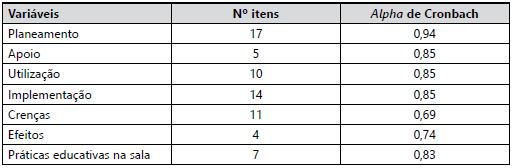 Em cada item os participantes devem dar uma resposta utilizando uma escala likert de três, quatro ou cinco pontos. Os escores totais para cada subescala são obtidos somando a resposta a cada item e dividindo-a pelo número de itens respondidos. Os valores de consistência interna da versão original foram muito elevados (Planeamento: α = 0,96; Apoio: α = 0,85; Utilização: α = 0,89; Implementação: α = 0,86; Crenças: α = 0,72; Efeitos: α = 0,82; Práticas educativas em sala de aula: α = 0,81) e esta apresenta bons indicadores de validade por referência a critério (Becker; Roberts; Dumas, 2000).