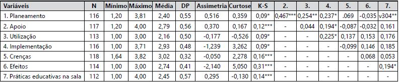 No Quadro 3, apresenta-se a estatística descritiva para cada dimensão das percepções sobre a implementação de práticas inclusivas, bem como as correlações (Spearman) entre as diferentes subescalas. Observaram-se distribuições bastante assimétricas, especialmente nas subescalas de implementação e efeitos das práticas educativas, com todos os escores das sete subescalas a apresentarem violações à normalidade. Encontraram-se correlações significativas entre a pontuação na subescala de planeamento e as pontuações nas subescalas de apoio, utilização e implementação das práticas inclusivas, e práticas educativas usadas em sala de aula. Encontrou-se igualmente uma correlação significativa entre a implementação de práticas inclusivas e uma pontuação mais elevada em termos de apoio e utilização anterior de práticas inclusivas. Por fim, verificou-se que maior percepção de efeitos positivos das práticas inclusivas estava associada a maior nível de recurso a práticas educativas como a aprendizagem cooperativa em sala de aula.
