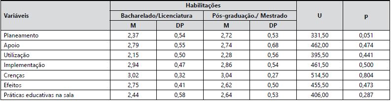 No Quadro 4, apresentam-se os resultados do teste de Mann-Whitney (U) para testar a existência de diferenças em função das habilitações literárias. Não se verificaram diferenças entre os grupos de educadores com diferentes níveis de formação a nível de nenhuma das sete dimensões das práticas inclusivas. Saliente-se, no entanto que o resultado do teste para a variável planeamento foi marginalmente significativo (p = 0,051), tendo os educadores com formação de nível pós-graduado relatado maior planeamento de práticas inclusivas do que aqueles sem formação pós-graduada.