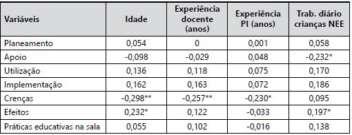 Encontraram-se também coeficientes de correlação significativos e negativos entre as crenças sobre as práticas inclusivas, a idade e os anos de experiência docente e na aplicação de práticas inclusivas, indicando que educadores mais novos, com menos anos de experiência e com menos tempo de experiência na aplicação de práticas inclusivas têm pontuações mais elevadas em termos de crenças sobre a inclusão.