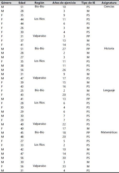 El instrumento de recolección de información fue una entrevista semi-estructurada, aplicada el segundo semestre de 2015, y corresponde a una adaptación del instrumento empleado en una tesis doctoral2. La adaptación fue validada por tres jueces expertos de cada disciplina. Las transcripciones son analizadas en base a una matriz teórica que contempla dimensiones o bloques temáticos intencionados para que emerja el discurso de los profesores durante la entrevista, relacionados con los tópicos abordados en la investigación: