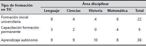 Veintidós profesores declaran haber tenido formación universitaria inicial, solo 9 afirman haber desarrollado cursos de capacitación, 36 señalan que han tenido formación autónoma. Esto revela la autonomía de los profesores por mantenerse actualizados e informados con respecto al uso de las tecnologías, asociado a las pocas instancias formales de especialización.
