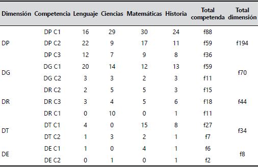 Al analizar las cuatro disciplinas se constata que la dimensión más frecuente es DP —integración de las TIC en los procesos de enseñanza y aprendizaje de los estudiantes— a partir de tres competencias que involucran, principalmente, integrar TIC a la planificación de ambientes y experiencias de aprendizaje, integrar TIC en la implementación de experiencias de aprendizaje y generar sistemas de información y comunicación mediada por computadores.