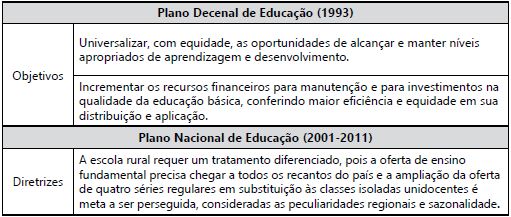 Quando analisamos a Educação do Campo presente nos dois Planos Nacionais de Educação, evidencia-se a pouca importância que o Estado Brasileiro atribuía à educação dessa população. A linguagem genérica e sem objetividade do Plano Decenal de Educação (BRASIL, 1993) é superada pela objetividade do PNE (2001–2011) (BRASIL, 2001), que, ainda assim, conta com evidente priorização pela educação urbana. A Educação do Campo, como apresentada no plano, é posta como um problema a ser enfrentado, ou seja, é objetivo do plano eliminar as classes unidocentes, ao invés de potencializá-las. Entretanto, não há, no PNE, metas ou estratégias que apontem para o enfrentamento da baixa qualidade das classes unidocentes, considerando a especificidade populacional do meio rural. Há, ao invés disso, a eliminação das classes, o que para muitas comunidades campesinas corresponde ao fechamento da escola, como ocorreu no Município de Poço Redondo, sertão sergipano, na última década (VIEIRA et al., 2012).