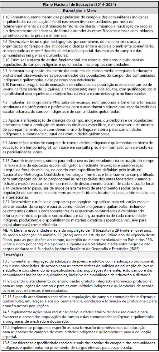O próximo passo se constituiria em consolidar, nos sistemas educacionais, a Educação do Campo, conforme demandada e reivindicada pelos movimentos sociais e aprovada pelas instâncias governamentais e normativas do país. Nesse contexto, o PNE (2014–2024) (BRASIL, 2014b) é importante instrumento na consolidação da Educação do Campo e na superação da Educação Rural, que nega aos povos o direito a uma educação que considere a terra, a cultura e o trabalho como basilares da proposta educativa para as escolas do campo.