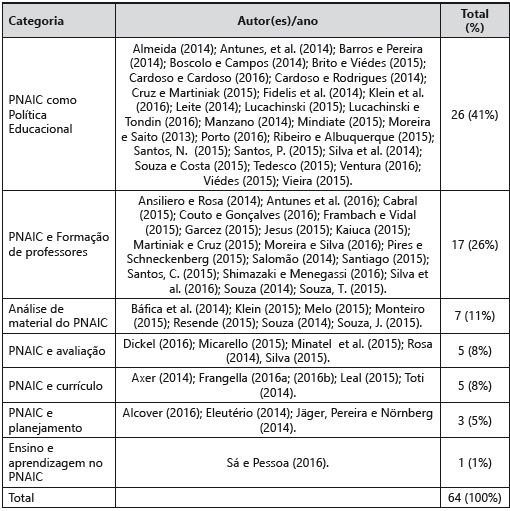 Nessa revisão, optou-se por analisar apenas os 64 textos decorrentes de pesquisa de campo ou documental, os quais foram classificados em sete categorias, definidas a partir da leitura integral dos textos (Quadro). Os demais trabalhos, classificados como relatos de experiência e trabalhos completos em anais de evento, não foram incluídos na revisão, mas constituem fonte de pesquisa para outros trabalhos que tenham, como objetivo, analisar os resultados do PNAIC.