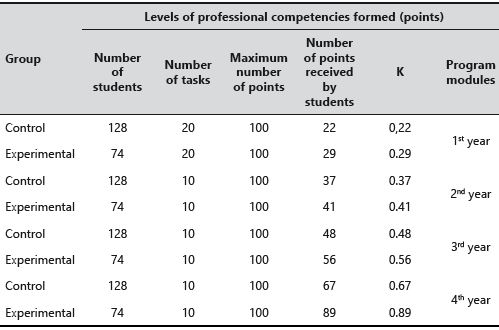 At the end of the experiment, the effectiveness of the development of professional competencies in learners was assessed according to the results of ascertaining and forming experiments.