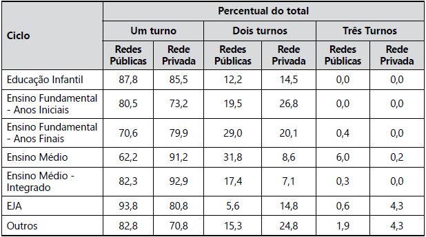 Os dados apresentados no Quadro 1, a seguir, mostram que a maioria dos professores da educação básica nas redes privada e públicas, tomados em conjunto, trabalha em um único turno. No entanto, há uma certa heterogeneidade entre etapas de ensino e redes. No caso das redes públicas, o percentual de professores que trabalha em um único turno é menor no ensino médio e anos finais do ensino fundamental (62,2% e 70,6%) do que na educação infantil e anos iniciais (87,8% e 80,5%). Por outro lado, na rede privada, é no ensino médio que se observa a maior porcentagem de professores trabalhando em um único turno, 91,2%, seguido do ensino infantil, 85,5%. Nota-se, ainda, que o percentual mais expressivo de professores que trabalha em três turnos foi observado nas redes públicas no ensino médio, 6%.
