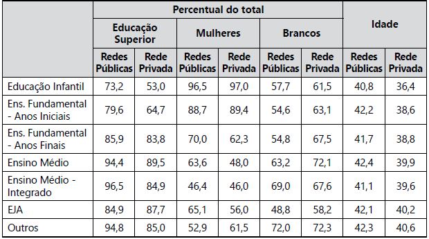 Portanto, em sua maioria, os professores são mulheres brancas que cursaram educação superior e possuem em torno de 40 anos de idade. Essas características são mais frequentes entre os professores do que na população geral entre 25 e 50 anos, na qual as mulheres são 52%, os brancos são 43%, os formados com graduação na educação superior, 18%, e a média de idade é um pouco menor, 37 anos.