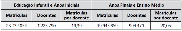O Quadro 3 apresenta a relação entre matrículas e número de professores em duas etapas agregadas: a primeira abrange a educação infantil e os anos iniciais do ensino fundamental, enquanto a segunda abrange os anos finais do ensino fundamental e o ensino médio. Essa separação entre os níveis de ensino se justifica pelas diferentes funções e atribuições do professor. Na educação infantil e nos anos iniciais, em função da legislação existente, é mais comum haver a figura do professor regente, responsável por uma turma e várias disciplinas, ao passo que, nos anos finais e ensino médio, tipicamente, cada professor oferece uma disciplina a várias turmas.1