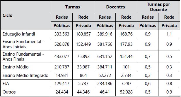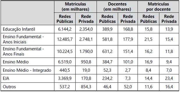 O Quadro 4 apresenta dados mais detalhados sobre a razão de matrículas e professor em cada etapa da educação básica, separando por redes públicas e privada. Com exceção da EJA e de Outros, em todos os demais níveis, a razão entre matrículas e professores é maior nas redes públicas de ensino. As redes públicas apresentam um pico nos anos iniciais do ensino fundamental, em que há 21,5 matrículas para cada professor. No entanto, a discrepância entre redes é maior no ensino médio, nível em que para cada professor de escola privada há 9,4 alunos, ao passo que para cada professor de escola pública há 16,9 alunos, ou seja, 80% a mais. Cabe observar que nas escolas privadas, o contrato de professores, tipicamente, se faz por horas/aula, e não por turnos parciais ou completos de trabalho, como nas redes públicas.