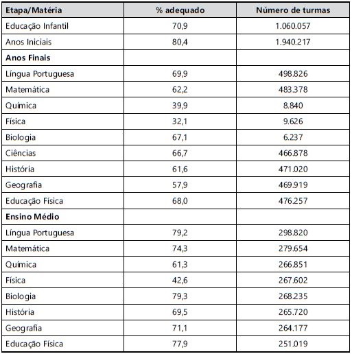 O Quadro 6 mostra que cerca de 80% das turmas de educação infantil e anos iniciais possuem professores com formação adequada. Já, nos anos finais e no ensino médio, as porcentagens são menores, variando de 32,1% em Física nos anos finais a 77,9% em Educação Física no ensino médio.