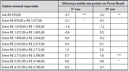 O que se observa é que as diferenças são bastante modestas. O maior impacto estimado vem da comparação do desempenho de alunos do 5º ano, cujo professor ganha até R$ 678,00, com um professor que ganha dez vezes mais, ou seja, R$ 6.780,00 ou mais. Nesse caso, a diferença é de 3,7 pontos a menos na prova para alunos cujos professores ganham menos. Nas séries finais, a maior diferença também aparece ao comparar os extremos: 3,2 pontos. Nota-se que a maioria das diferenças estimadas não é estatisticamente significante, ou seja, não se pode dizer que as diferenças encontradas são diferentes de zero para 15 das 20 diferenças estimadas. Isso significa que o salário recebido tem pouca ou nenhuma correlação com o desempenho dos alunos do 5º e 9º ano.