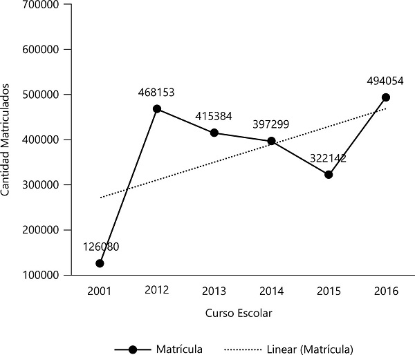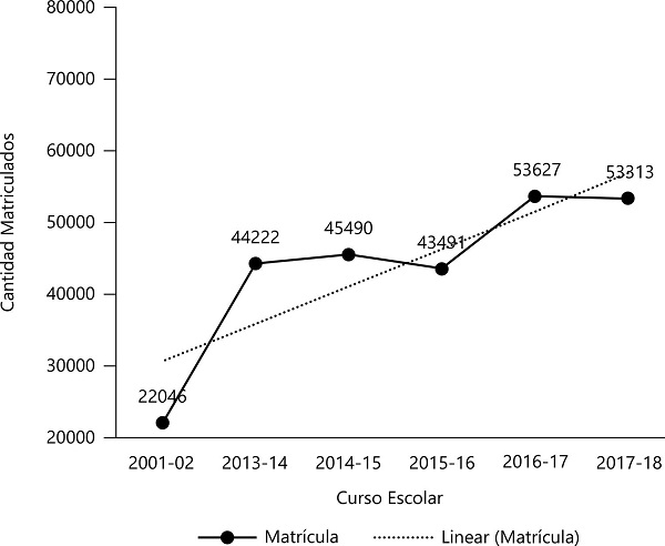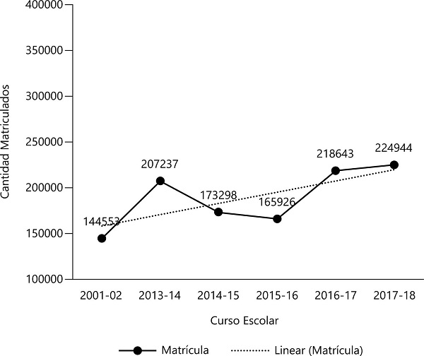 Así mismo, de una matrícula inicial en la educación superior en el curso 2001-2002 de 144 553 alumnos (ONE, 2007), se llegó a un máximo de 743 979 en el curso 2007-2008, lo que en el curso 2017-2018 se encontró en 224 944 matriculados. De dicha matrícula, en este curso el 61,2 % son mujeres (137 687) (ONEI, 2018).