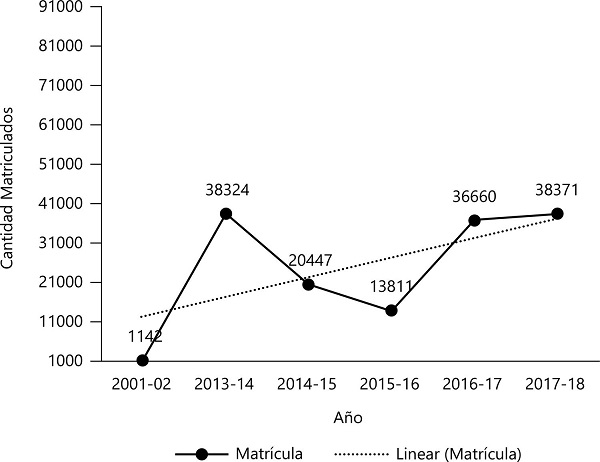 La evolución de la matrícula en este nivel educacional desde inicios de siglo hasta los últimos 5 años muestra una tendencia ascendente.