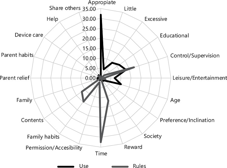 A first approach to the qualitative data show that the 1,389 comments generated can be easily grouped into two main topics: the use of ICT by young children, and the rules that parents establish for it. Figure 2 shows how those 1,389 comments are distributed according to the established categories.