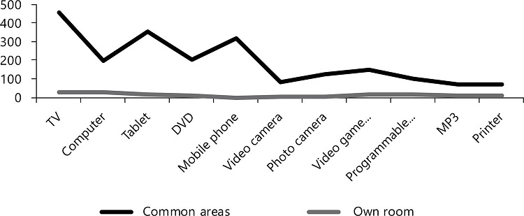 Another question that served to answer the first research objective was the one aimed to know the location of the technologies that the children claimed to use, indicating whether these were in a “common area” or in their “own room” ( Figure 5 ).
