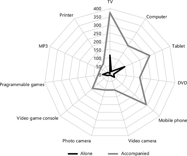 The results show how children use TV alone (f=112, 21.9%) with values that are very similar to those of the use they make of the tablet, also alone, (f=98, 19.1%). Here are the comments of two mothers, one of a 3-year-old boy and the other of a 4-year-old girl: