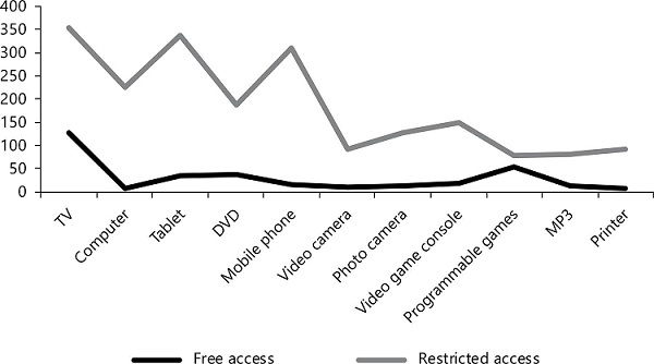 Of the technological tools proposed ( Figure 3 ), the results show that TV (f=352, 68.8%) and mobile phones (f=310, 60.5%) obtained the highest frequency with regard to the variable “restricted access”. However, the individuals surveyed highlighted that they make very little restricted use of tools like programmable games (f=78, 15.2%), or MP3 players (f=82, 16%).
