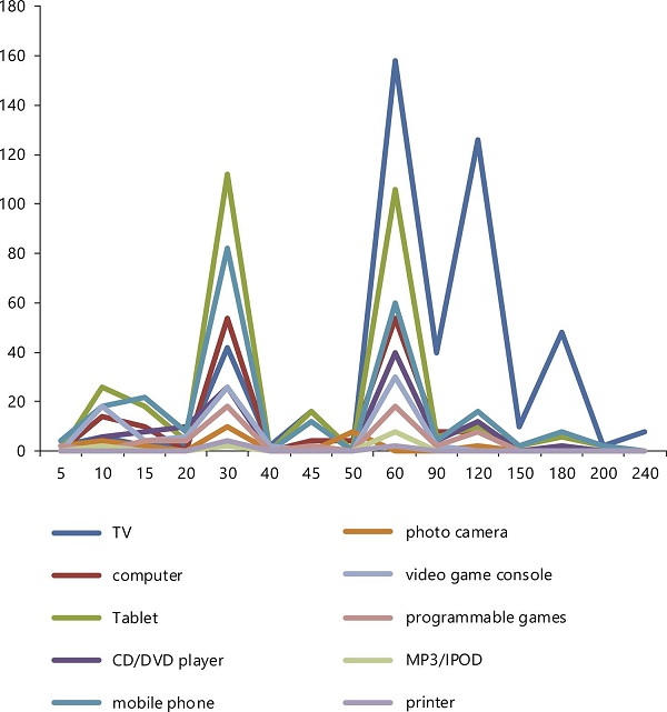 It can also be stated that the use of ICT devices occurs in a place where the children can be controlled (common areas), although it must be highlighted that a small percentage of the children interviewed have a TV and a computer in their own room. Regarding the time of use, most of the devices proposed in the present study are used for about one hour; in some cases, like the TV, this time is overpassed, and it can be up to two or three hours per day.