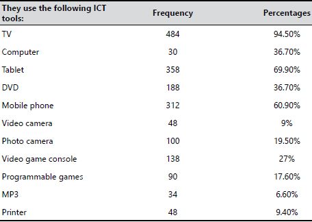 With respect to which are the ICT tools used by children, the parents indicated that they USE the ones listed in Table 3 , which also shows the percentage and frequency of parents that answered “yes” for the use of each of them.