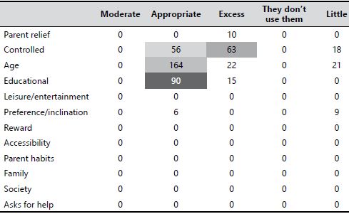 Significant relationships were found between some of the categories used to gather the comments related to the USE of technology. The most representative relationship established was the one between the categories Appropriate and Age. This means that, somehow, the rules and criteria of use are determined by the age of the child. The following comments show the opinions of the parents: