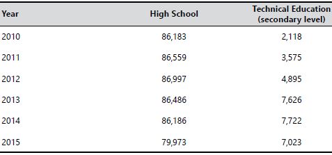 Table 1 presents data from the School Census for the years 2010 to 2015. These data indicate a 116% increase in the number of students enrolled in Professional and Technological Education (EPT) in the period from 2011 to 2014 and a slight decrease from 2014 to 2015, which accompanied the downward trend in High School.