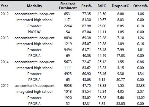 To provide basic information for construing the problems associated to the pass rates, failure rates and dropout rates in technical education for the period 2012-2015 in the REE/MS the respective figures are set out in Table 2.