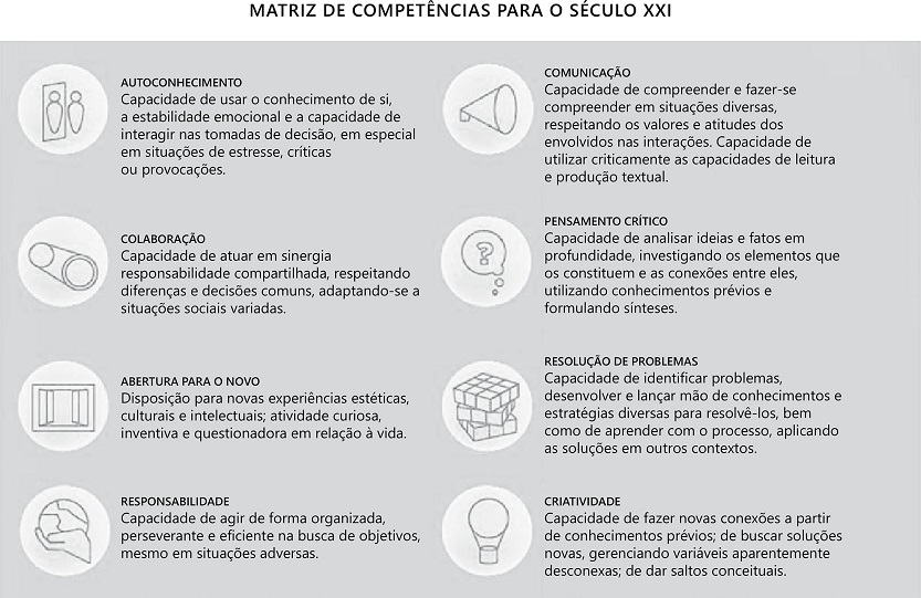 ensinar os conteúdos curriculares a partir de uma matriz de competências para o século 21, flexível e customizável a partir de diferentes modelos de escola – que combina competências cognitivas – como a resolução de problemas e o pensamento crítico – com competências socioemocionais – como a colaboração e a responsabilidade (IAS, 2012b, p. 13).