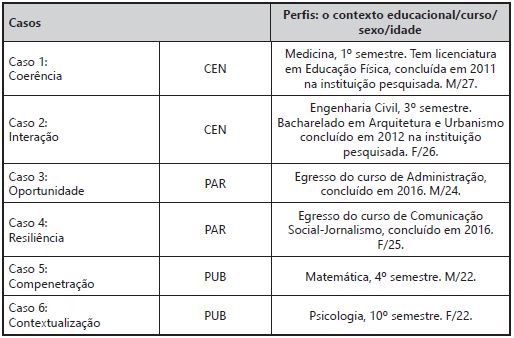 Tendo essa escolha recaído sobre um estudo de casos múltiplos holístico ( YIN, 2010 ), considerou-se uma só unidade de análise, efetivamente, como eixo central do problema de pesquisa: estratégias de superação da lógica violência-exclusão-silêncio em contextos de priorização dos aspectos informativos da educação. Essa unidade pôs sob o mesmo olhar aspectos particulares de cada um dos casos, enquanto o conjunto destes direcionou o olhar dos pesquisadores para as perspectivas teóricas postuladas pelos quatro pilares da educação para o século XXI, pela pedagogia dialógica ( DELORS et al. 1998 ; FREIRE, 2011 ), bem como por outros referenciais acrescentados durante as análises. Com estas delimitações, obteve-se uma visão geral de cada caso e de seu conjunto, sendo que os casos únicos tiveram denominações específicas, cada uma delas escolhida com base na característica do estudante mais favorável à mencionada superação: Coerência, Interação, Oportunidade, Resiliência, Compenetração e Contextualização.