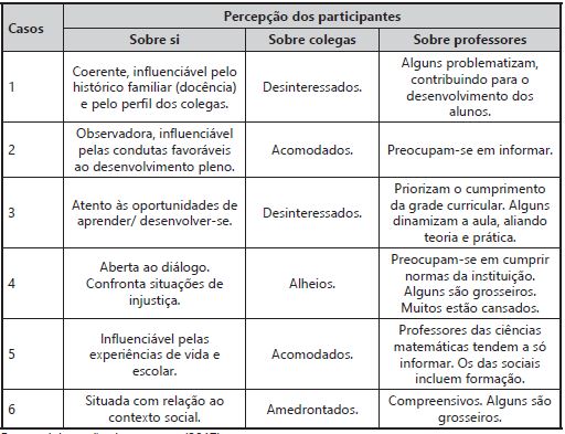 Com os resultados e análises, elaborou-se um quadro, contendo percepções dos participantes sobre si, colegas e professores, relacionadas com a formação para a integralidade humana (ver Quadro 2 ).