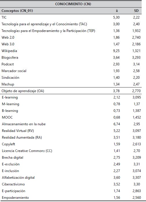 Las valoraciones presentan una desviación típica muy alta, lo que indica que existe muy poca homogeneidad en las respuestas, debido a la existencia de diferentes niveles en los futuros Educadores Sociales, quienes se suspenden desde el punto de vista conceptual ya que, en la mayoría de los casos, la autoevaluación se sitúa por debajo del cinco. De todos los conceptos propuestos, solo el 14,2% son conocidos por los estudiantes, correspondiéndose este porcentaje con las nociones de Wikipedia, almacenamiento en la nube, TIC y realidad virtual.