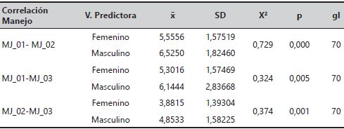 Los tres sub-apartados referidos al manejo (tabla 10) se relacionan significativamente en función de la variable predictora, a favor del género masculino. Aquellos que mejor creen manejar los dispositivos tecnológicos, son los que mejor creen manejar tanto las herramientas (X2 = 0,729; p < 0,01) como los servicios (X2 = 0,324; p < 0,01). También se encontró una relación altamente significativa entre el manejo de herramientas y de servicios (X2 = 0,374; p<0,01).