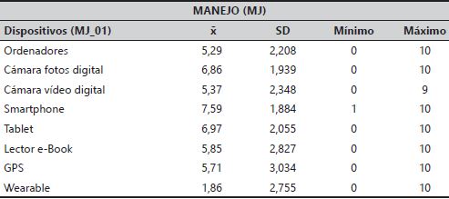 En la mayoría de capacidades para el manejo de dispositivos (tabla 2), se autoevalúan con puntuaciones superiores a 5, excepto en la utilización de wearable, en la que se suspenden (X = 1,86). Los dispositivos que mejor dicen manejan son la cámara de fotos digital (X = 6,86, SD = 1,939), el Smartphone (X = 7,59; SD = 1,884) y la Tablet (X = 6,97, SD = 2,055).