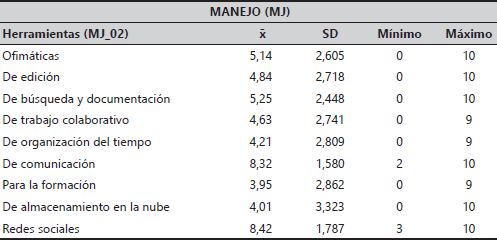 En cuanto a las herramientas (tabla 3), aseguran que son capaces de manejar de forma notable las redes sociales y las de comunicación. También se aprueban en las de búsqueda, en las de documentación (buscadores, publicaciones electrónicas, recursos didácticos, objetos de aprendizaje, etc.) y en las de ofimática. Por contra, se suspenden cuando se trata de manejar herramientas para la formación (plataformas e-learning. Moodle. etc.).