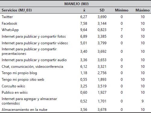 Respecto a los servicios (tabla 4) su uso es bastante bajo y las valoraciones son más dispersas, con distribuciones muy heterogéneas (desviaciones típicas, en muchos casos, superiores a 3). Se ven muy competentes para manejar WhatsApp y utilizan más Facebook que Twitter. No tienen ni blog ni sitio web propio, no utilizan el almacenamiento en la nube y no consultan ni publican en wikis, pero sí usan Internet para compartir fotos y vídeos, aunque no para publicar y compartir presentaciones, audios, y mucho menos, contenidos.