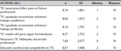 La actitud hacia las TIC (tabla 5) es muy positiva (medias próximas o superiores a 8). Reconocen que son necesarias y útiles para su futuro profesional, para economizar esfuerzo en su futura profesión y que pueden ayudarles en su desarrollo profesional. Consideran que el uso de las mismas es un medio útil para seguir formándose (valoración con la media más alta), a pesar de que sus valoraciones manifiestan que no utilizan herramientas tecnológicas para su formación.
