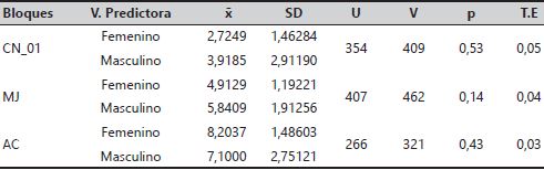 Mediante un análisis exploratorio inicial se comprobaron los supuestos paramétricos de normalidad y se aplicó para la evaluación de ajustes las pruebas de Kolmogorov-Smirnov y de Homocedasticidad de Levene. A partir de ellas se optó por la utilización de la prueba no paramétrica de contraste de hipótesis U de Mann-Whitney, situando el umbral para el nivel de significancia en 0,05. Esto nos permitió verificar la existencia de diferencias significativas en función de la variable predictora de género.