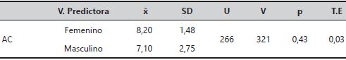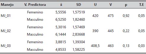 Una vez comprobadas las condiciones paramétricas de homogeneidad y normalidad, se realizó un contraste de hipótesis, para confirmar si las diferencias de medias para grupos independientes percibidas resultaban o no significativas, y se empleó la prueba U de Mann-Whitney para verificar la relevancia de estas diferencias en función del género.