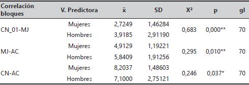 Los bloques estudiados se correlacionan en función del género (tabla 9), dos relaciones a nivel 0,01 y una de ellas a nivel 0,05. A mayor conocimiento de conceptos tecnológicos mejor manejo de la tecnología (X2 = 0,683; p < 0,01), a favor de los hombres. También, con un grado de significatividad de 0,01, tiene relación el manejo con la actitud, ya que a mejor manejo de la tecnología se manifestó una actitud más positiva hacia la misma, en este caso favoreciendo igualmente a los hombres (X2 = 0,295; p = 0,01). La relación entre conocimiento y actitud es de densidad más débil (a nivel de 0,05) y en este caso son las mujeres las favorecidas por esta relación (X2 = 0,246; p > 0,01).