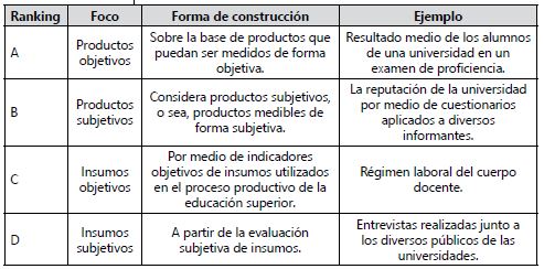 Sumado a ese contenido, también fue tomada como referencia una tipología de rankings recreada por Calderón, França e Gonçalves (2017) a partir del estudio producido por Andrade (2011), que inicialmente generó una tipología de cuatro tipos diferentes, los cuales pueden ser observados en el Cuadro. A esa tipología elaborada con base en la combinación de dos matrices de variables (insumo-producto y subjetivo-objetivo), Calderón, França y Gonçalves (2017) incorporaron la existencia de otro tipo de tabla clasificatoria, denominado rankings híbridos (Figura 1), los cuales presentan como característica la presencia combinada y variable de indicadores construidos simultáneamente a partir de productos y/o insumos, colectados por medio de informaciones simultáneamente objetivas y/o subjetivas.