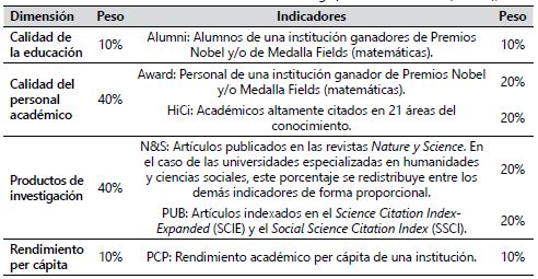 El ARWU, versión 2017, usa seis indicadores distribuidos en cuatro dimensiones: Calidad de la educación; Calidad del personal académico; Productos de investigación y Rendimiento per cápita (ARWU, 2017). El detalle de los indicadores y sus pesos porcentuales se puede revisar en la Tabla 1.