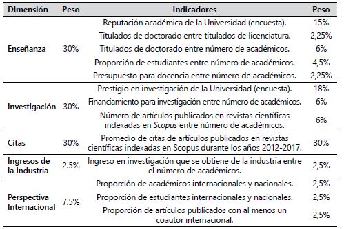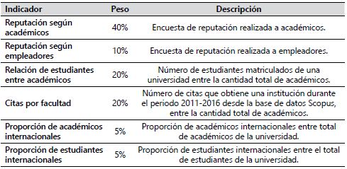 El RQS (QS, 2018), utiliza seis indicadores que servirán para evaluar a las universidades: las encuestas de reputación (una a académicos y otra a empleadores); la relación existente entre la cantidad de estudiantes y la cantidad de académicos; el número de citas por la cantidad de académicos, y el nivel de internacionalización de la institución (expresada en proporciones de académicos y estudiantes extranjeros). El peso de cada uno de los indicadores se expresa en la Tabla 2.