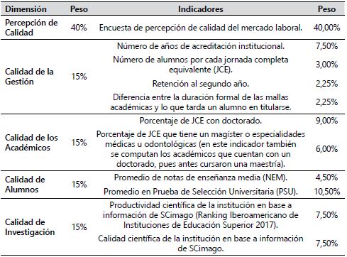 Gran peso porcentual en esa tabla clasificatoria se lo lleva la Percepción de Calidad que el mercado laboral le otorga a las casas de estudio, cuyo levantamiento de datos lo realizó la empresa de estudio e investigación de mercados “Feedback” de manera online. Los entrevistados evaluaron cada una de las universidades en una escala de 1 a 7, donde 1 significa “muy mala calidad” y 7 “muy buena calidad”. Referente a los datos sobre gestión, académicos y alumnos, estos son extraídos de portal específico del MINEDU (CHILE, 2017). La información correspondiente a la variable investigación es proporcionada por SCImago Research Group, quien, a su vez, utiliza la base de datos de Scopus para la presentación de sus informes (QUÉ PASA, 2017).