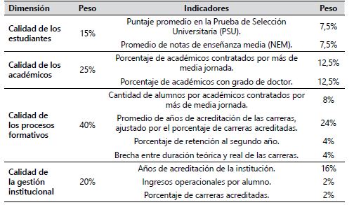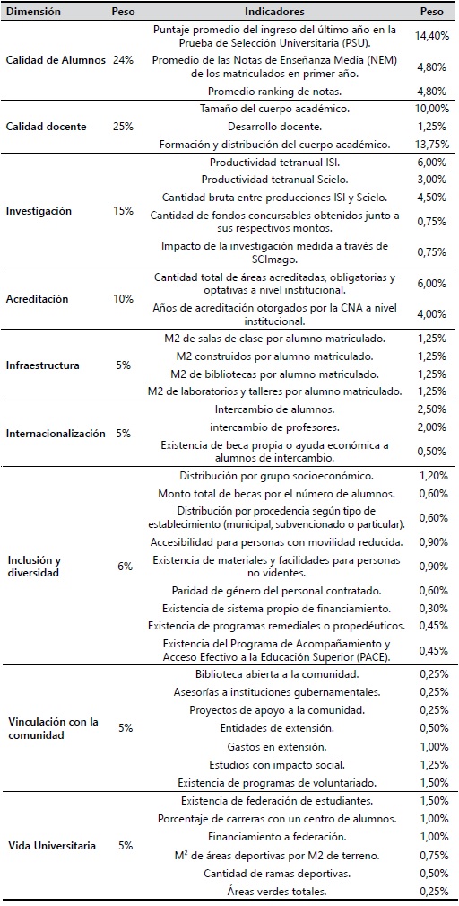 El RU&EM utiliza once indicadores que sirven para listar a las universidades chilenas, los cuales se encuentran ordenados bajo cuatro dimensiones: calidad de los estudiantes, calidad de los académicos, calidad de los procesos formativos y calidad de la gestión institucional. La versión 2017 cuenta con varias modificaciones metodológicas con respecto a su símil del 2016. Entre los cambios mencionados, destaca la eliminación del indicador “estudiantes con AFI”, el cual fue reemplazado por “Promedio puntaje PSU” y “Promedio de notas de enseñanza media”; a su vez, el indicador “gasto por alumno” es substituido por “ingresos por estudiante”; y por último, son realizadas correcciones metodológicas a los indicadores “porcentaje de carreras acreditadas” y “promedio de años de acreditación por carrera” (EL MERCURIO, 2017b). En la Tabla 5 es posible advertir los indicadores que finalmente fueron usados para este ranking.