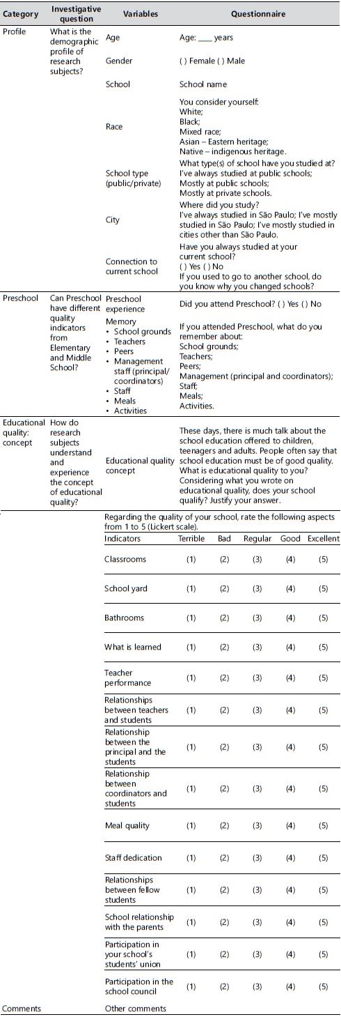 Despite their considerable differences, the questionnaire and the focus group worked complementarily towards that goal. The questionnaire was prepared to gather information using different categories, as synthetized in Table 1.